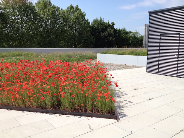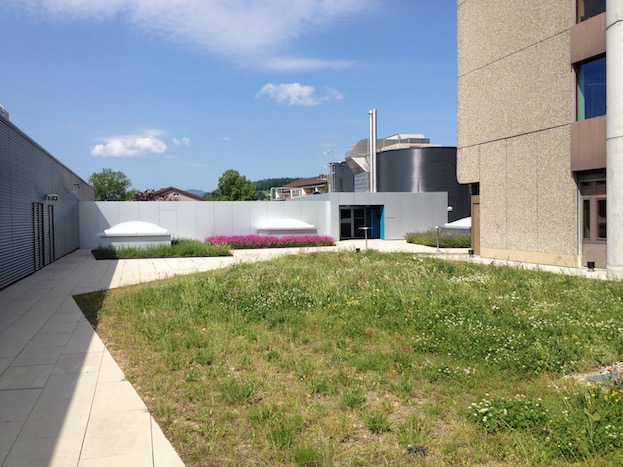 Das 6600m2 grosse Dach des Einkaufzentrums Telli musste totalsaniert werden (inkl. Aufbauten). Ein polygonales Platz-Weg-System durchzieht die ganze Dachfläche. Anstelle einer fast 50cm dicken Überdeckung mit Humus war Gewicht sparen angesagt. Die Substrathöhen sind neu noch zw. 10-20cm hoch und in unterschiedlichsten Kornfraktionen sandigkiesiglehmig gehalten. Die entsprechenden Vegetationsbilder der benachbarten Aarelandschaft und der Juramagerwiesen wurden von Stephan Brenneisen vorgegeben. Bei der Cafeteria des Kantons erscheinen in Pflanzinseln monokulture Auszüge der grossen Blumenwiesen (
