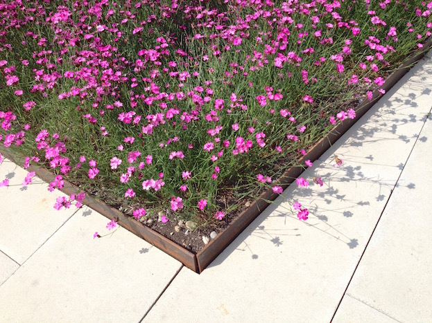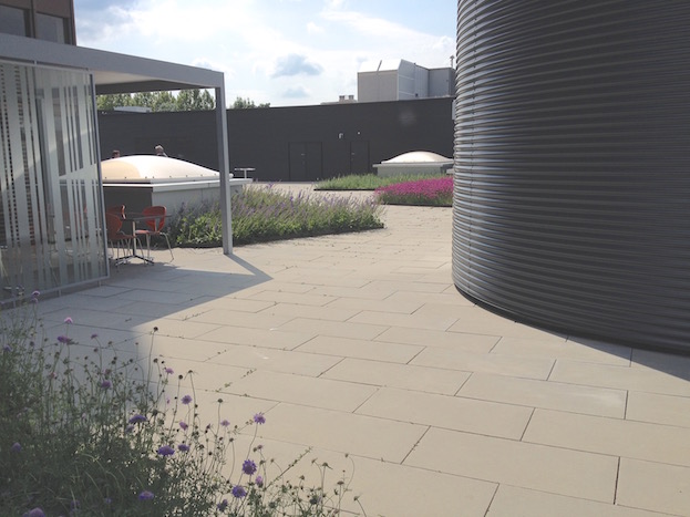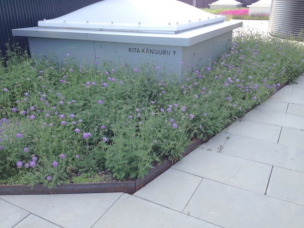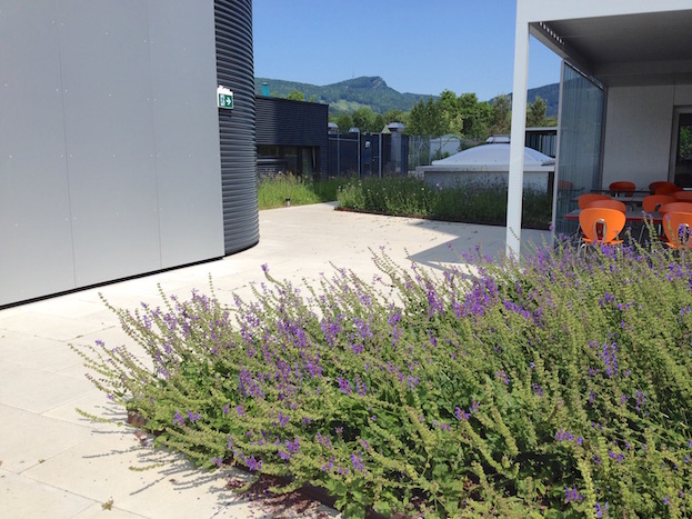 Das 6600m2 grosse Dach des Einkaufzentrums Telli musste totalsaniert werden (inkl. Aufbauten). Ein polygonales Platz-Weg-System durchzieht die ganze Dachfläche. Anstelle einer fast 50cm dicken Überdeckung mit Humus war Gewicht sparen angesagt. Die Substrathöhen sind neu noch zw. 10-20cm hoch und in unterschiedlichsten Kornfraktionen sandigkiesiglehmig gehalten. Die entsprechenden Vegetationsbilder der benachbarten Aarelandschaft und der Juramagerwiesen wurden von Stephan Brenneisen vorgegeben. Bei der Cafeteria des Kantons erscheinen in Pflanzinseln monokulture Auszüge der grossen Blumenwiesen (